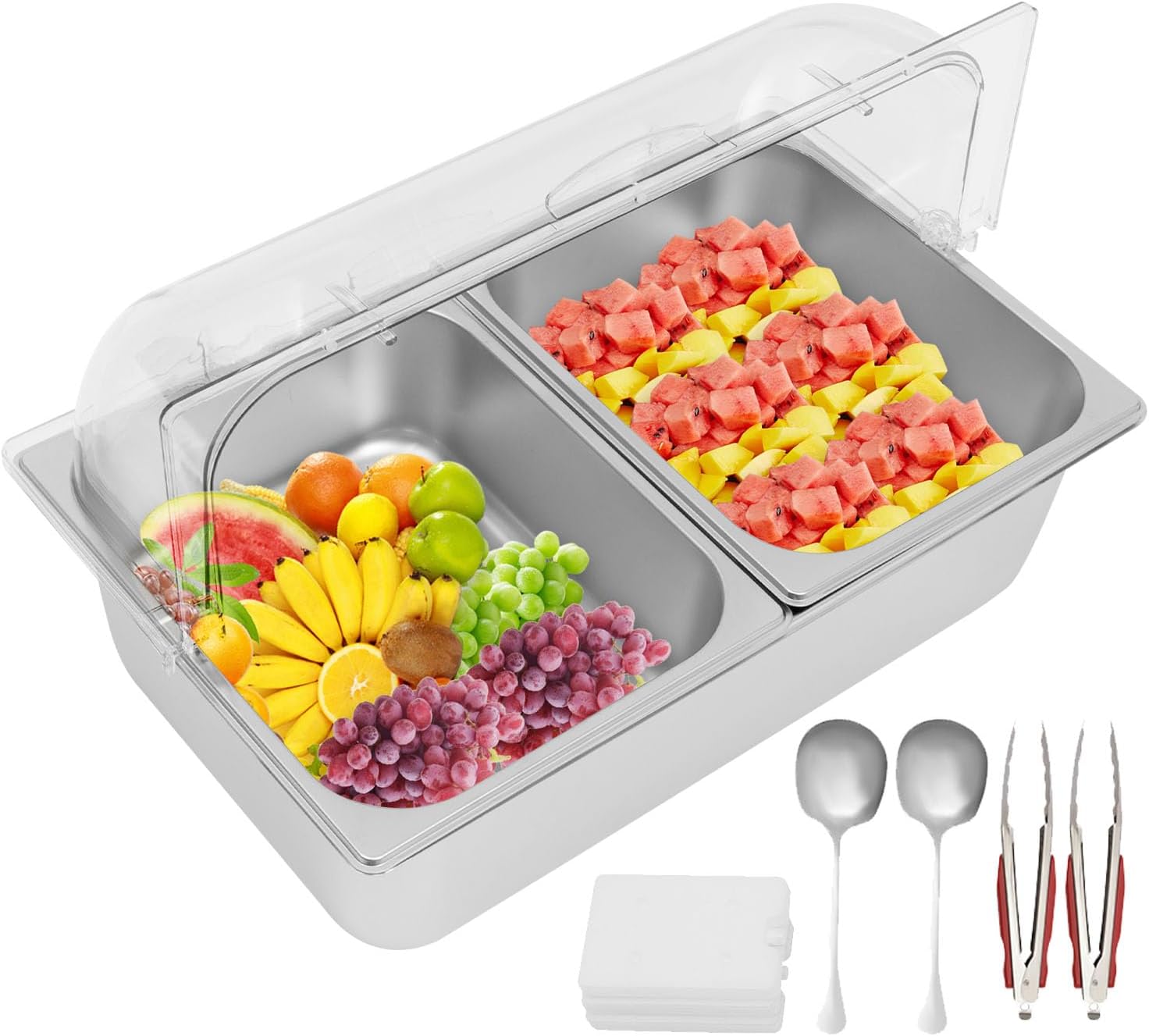 ❀Description:This food serving container is made of high-quality 201 stainless steel, durable, and easy to clean. Unique double compartment design can place different fruits separately, keeping the original flavor, healthy and hygienic. The flip lid design can effectively prevent dust and maintain freshness, retaining the flavor of the fruit, whether, for daily use at home or with guests, it can show your taste and intention!❀Specification:Material: 201 Stainless Steel, HDPE, PCColor: Silver, ClearStyle: ModernShape: RectangularDishwasher Safe: Yes Mount Type: DesktopAssembly Required: YesNumber of Compartments: 9Number of Spoons: 9Number of Clamps: 9Number of Water Bags: 3Closure Type: Flip TopFlip Top Height: 18cm/7.09 inCompartment Depth: 10cm/3.94inContainer Size: 53.5×33.5×15cm/21.06×13.19×5.91 inPackage Size: 60×40×21cm/23.6×15.7×8.3inNet Weight: 4.6kg/10.14lbsGross Weight: 5.7kg/12.57lbs❀Package Content:1× Food Serving Container9× Spoons9× Clamps3× Water BagsNotes :1.Please check the style and size before purchasing.2.Please note that this product does not contain any food inside.3.Please note that the lid is not suitable for cleaning inside the dishwasher.4.Please fill the water bag with water and put it in the refrigerator to freeze before use.5.Please allow the slight color difference caused by the shooting light and 1-3cm error due to manual measurement and make sure you do not mind before ordering.
