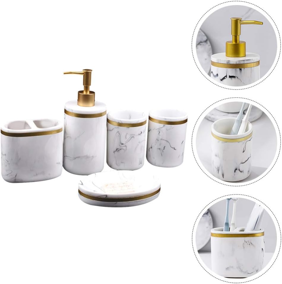 Description This simple, elegant and stylish bathroom accessories set will bring character and life to any bathroom. All items are made of resin material. They help you organize your washing tools and keep your bathroom tidy and organised. Modern marbling appearance will well blend with bathroom decorative style. Features- Color: Assorted Color- Material: Resin- Size Toothbrush Holder: Approx. 9. 6 x 11 cm/ 3. 78 x 4. inch- Size Dish: Approx. 14. 4 x 9. 5 cm/ 5. 67 x 3. 74 inch- Size Lotion Dispenser: Approx. 7. 9 x 18. 5 cm/ 3. 1 x 7. 27 inch- Size Cups: Approx. 7. 7 x 9. 9 cm/ 3. 03 x 3. 89 inch- Made of resin material for durable and use.- Simple but practical, this 5 pieces bathroom set can meet your daily washing needs.- Stylish design will bring elegance and charm to any bathrooms.-, smooth surface, texture, not easy to deform and break, fashionable and decorative.- Easily organize of bathroom supplies, and keep the bathroom clean and orderly. Package Including 1 x Set of 5Pcs Bathroom Accessories
