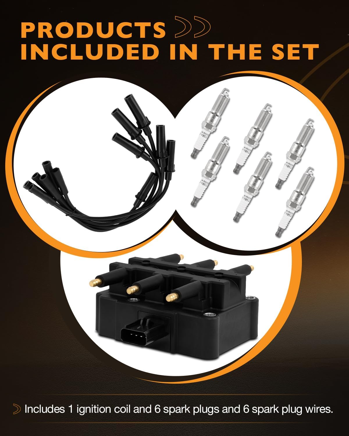 - Complete Kit-The package includes 1 ignition coil, 6 iridium spark plugs and 6 Spark Plug Wires. The manufacturing of ignition coil, spark plug sets and wire sets complies with OE specifications, enhancing reliability and high performance.