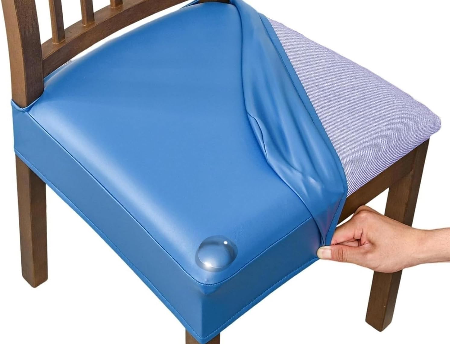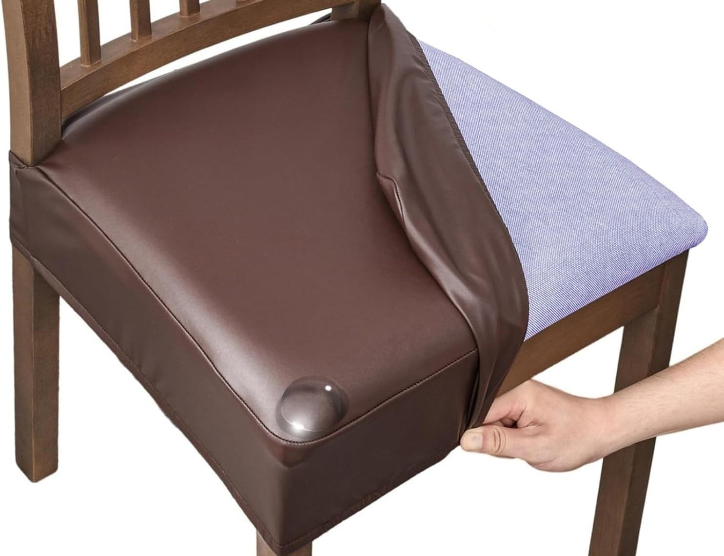 Measure Before Buy: Stretch dining chairs seat covers leather are suitable for seat cushions with length: 14-20 inch/35-50cm, width: 14-20 inch/356-50cm, and thickness: 2-4 inch/5-10cm. Not fit for the chair with arms or without rear gap, please refer to our pictures, look at your chair type and measure the size carefully before buyingBetter Protector: Waterproof kitchen chair seat covers are made of highQuality pu leather, notOnly soft and wrinkle-resistant, but also veryDurable. Leather seat covers for dining chairs have excellent waterproof properties, protects your chairs from stains, dust, bites and pet hairFirmly Fixed: Stretch chair seat covers for dining chairs with rear covered design, can be secured in seconds. Just slip the cover from the chair back, no need to remove the chair cushions. Elasticated bottom edges and elastic band hold the cover firmly in place without slipping or sliding off, provide tight protection for your chairEasy to Stay Clean: Leather seat covers dining chairs have excellent waterproof characteristics, like an invincible shield for your chairs, so stains can't penetrate. And surprisingly, black chair covers dining chairs protectors are extremely easy to clean, grease splatters can be easily wiped away, provides you a comfortable dinner environmentWhole New Experience: Simple modern style slipcovers for seat chair for dining chairs can make your chair more advanced, different colors can meet your different needs. With time elapsing, your chair may show wear and tear. With this leather dining room seat covers, you can give your beloved chair a whole new lifeChair Covers Slipcovers adopt full waterproof technology and leak proof,protect your furniture from spills, stains and tearing.Super Soft Dining Chair Covers is comfortable to touch,High Stretch PU Fabric make these chair covers perfectFit for your barstoolDiverging from the surface fleece fabric, smooth seat covers slipcovers is not easy to conce